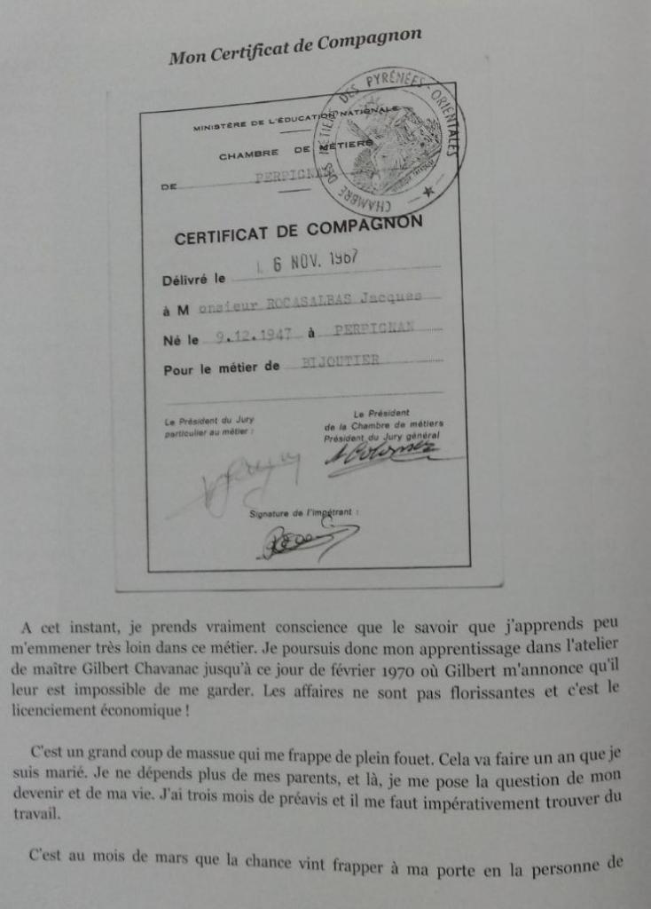 Issu d'une famille de boulangers en Occitanie, Jacques entre en apprentissage à 16 ans et réussit parfaitement. Il obtient son Brevet de Compagnon. Reconnu, il est employé par divers grands bijoutiers de la région. Il monte sa propre entreprise et crée des bijoux originaux dont les photos figurent ici. Il est reconnu "Meilleur Ouvrier de France".
